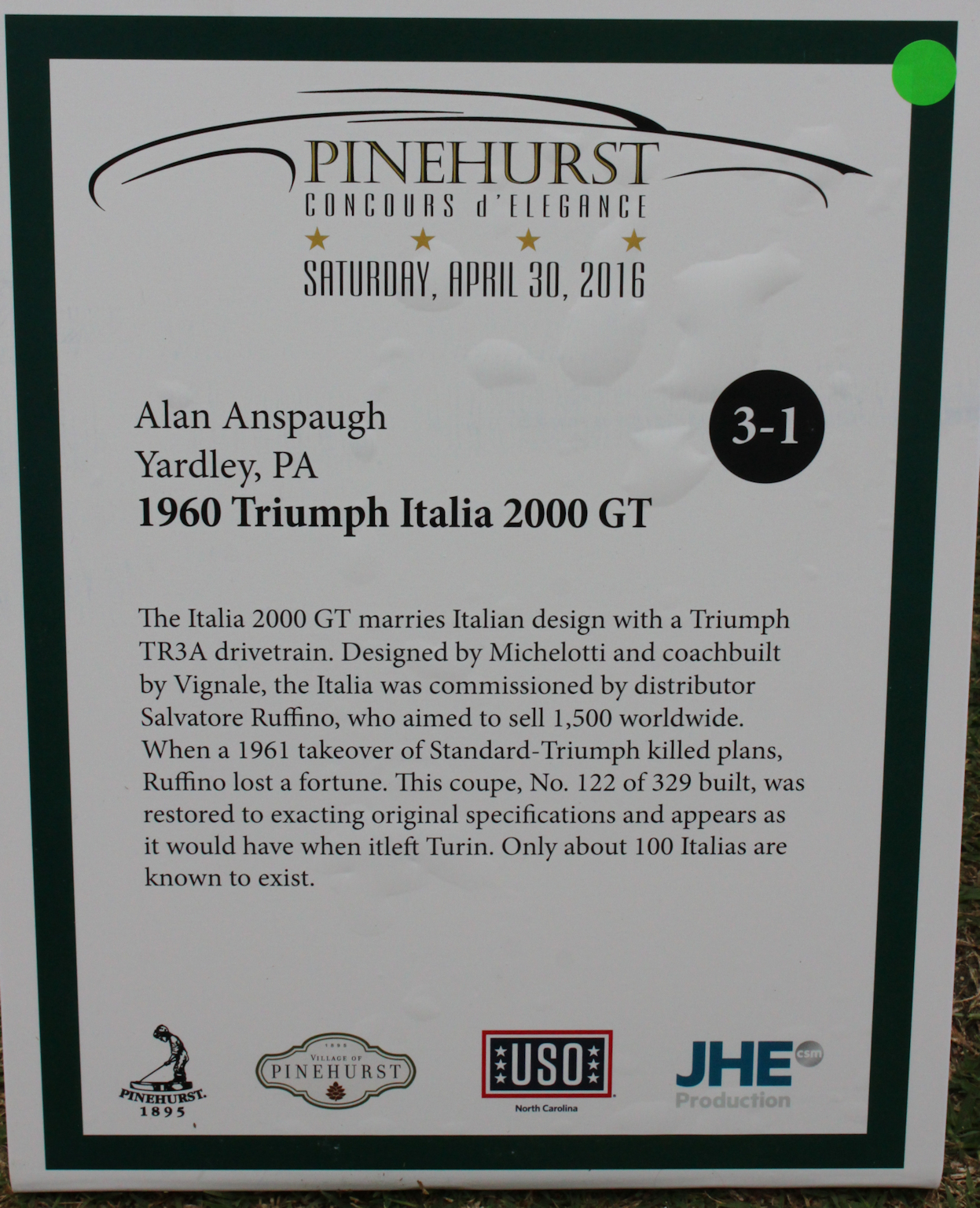 Again, from the Pinehurst Concours this past weekend via Leigh Gill. This 1960 Triumph Italia 2000 GT is certainly something you won’t see at your average car show, and you definitely won’t come across one on the street.